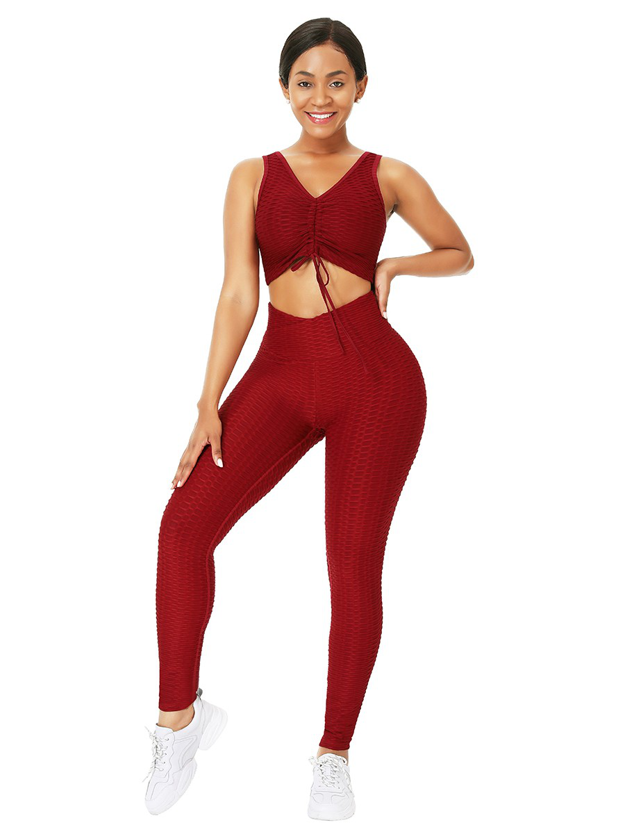 Wine Red Crop Yoga Top And High-Waist Leggings High Elastic